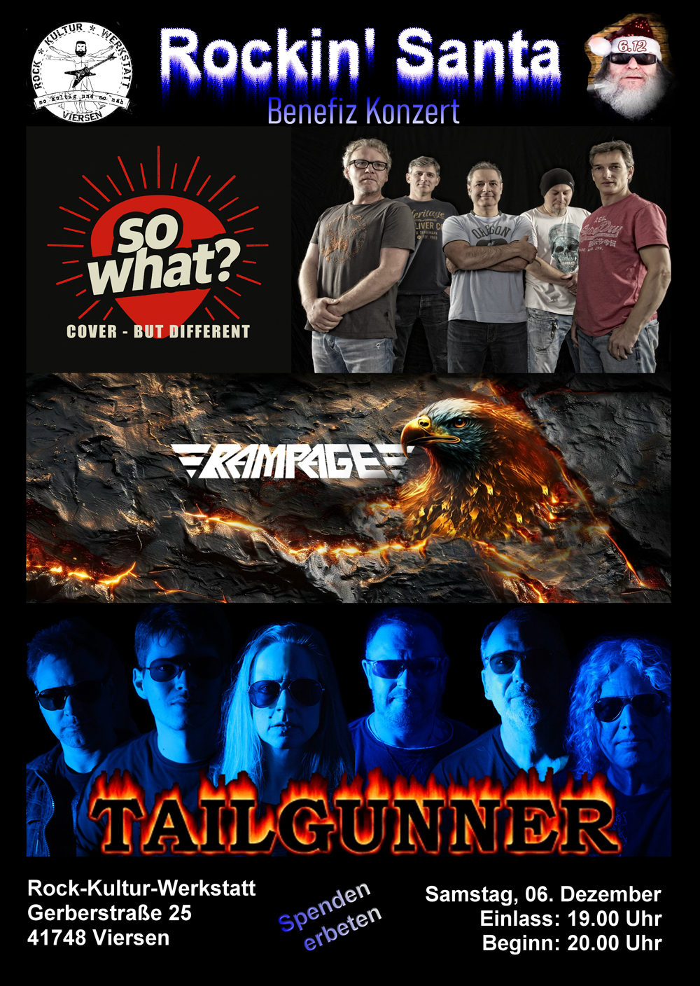 Benefiz Konzert zusammen mit SO WHAT und RAMPAGE zu Gunsten der Rock Kultur Werkstatt Viersen. Eintritt frei, aber eine Spende wird erwartet.